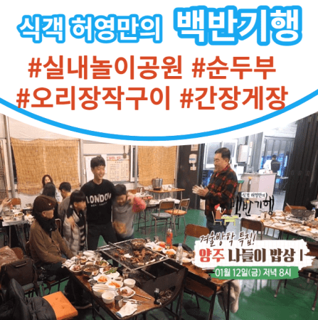 230회 1월 12일 백반기행 임채무 씨와 양주 참나무오리장작구이 닭구이 순두부 보리밥 간장게장정식 실내놀이공원 동산 주진모 씨의 파이널 편을 알아보았습니다.