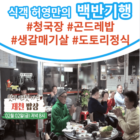 2월 2일 233회 백반기행 제천 밥상 맛의 시크릿 가든에서는 배우 이병준과 함께 곤드레밥 청국장 생갈매기살 등갈비 비빔국수 도토리정식 묵 빈대떡 산초두부구이 생감자옹심이 감자전을 알아보았습니다.