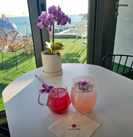 햇빛이 잘 들어오도록 천장을 높이고 한 벽면을 통유리로 만들고 다양한 호접란들을 진열해 놓고 음료와 디저트에도 호접란이 들어있습니다.
