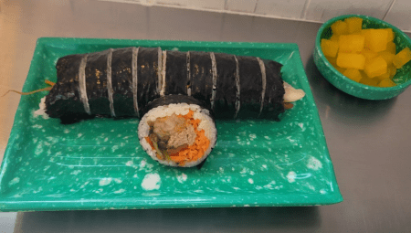 또 다른 인기 메뉴인 진미채김밥은 뜨거운 물에 30분 이상 담가 부드럽게 만든 진미채에 고춧가루와 고추장으로 만든 양념장으로 버무려주어 진미채김밥을 완성됩니다.