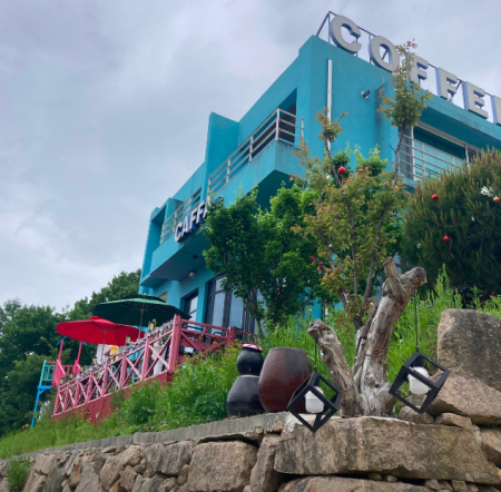 황량한 겨울 풍경이 이어지는 평지에 우뚝 서 있는 민트색과 핫핑크색의 건물은 사장님이 직접 짓고 운영 중이라는 카페입니다.