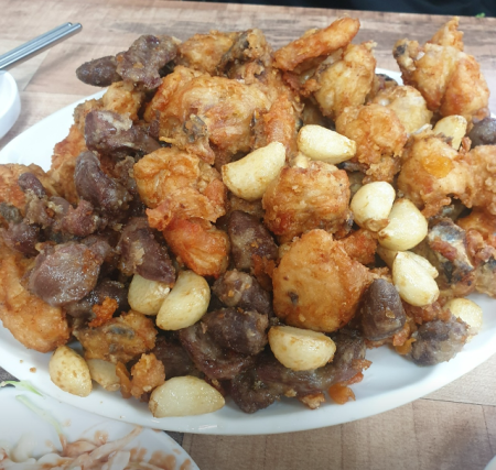 통닭 한 마리를 주문하면 서비스로 닭모래집과 염통, 통마늘까지 듬뿍 올려줘 그 양이 산더미로 오래전부터 해오던 서비스로 그대로 해오고 있습니다.