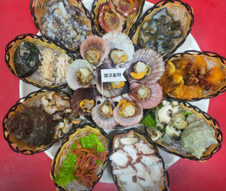 기본 안주들이 먼저 나오고 따라 나온 해물모둠에는 10가지의 해산물이 나옵니다. 홍가리비, 개불, 돌멍게, 석화, 뿔소라, 문어, 참소라, 멍게, 전복, 산 낙지로 구성되어 있습니다.