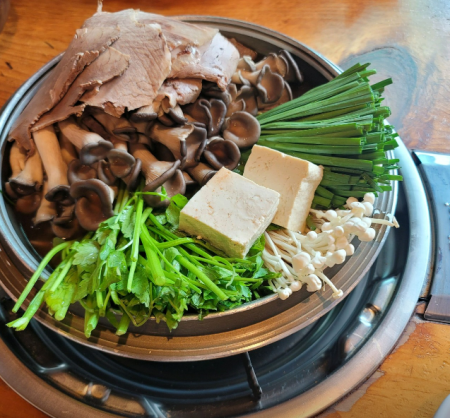 미나리, 부추, 버섯, 두부, 고기 등이 한가득 올려진 전골이 나오고 끓일때까지 한참을 기다린 끝에 앞 접시에 담아먹었습니다.