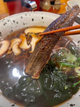 청어 소바에 올리는 청어는 말리고 구워서 살짝 달달한 맛을 내는 것이 일반적이고 메밀의 쫄깃한 맛과 비리지 않은 청어와의 조합이 일품입니다.
