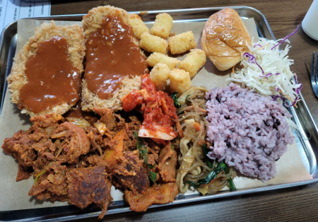 1인 돈가스를 무한리필 7,900원에 먹을 수 있는 곳으로 한식뷔페처럼 제육볶음, 떡볶이, 잡채 등 다양한 메뉴가 있습니다.