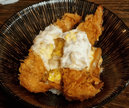 밥 위에 바삭한 튀김이 가득 올라간 가츠동이 나오고 밥 위에 올라가 있는 돈가스는 고기가 두툼하고 깨끗한 튀김옷을 입어 고기의 퀄리티가 상당히 좋습니다.