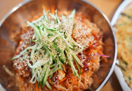 아삭한 채소와 함께 국수가 비벼져 나왔고 매콤한 소스의 맛이 느껴지고 살짝 느껴지는 단맛과 다른 곳과는 다르게 깔끔한 맛입니다.