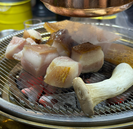 숯불에서 바로 굽다 보니 한 점 먹어보면 진한 숯불향이 나고 목살은 부드럽고 항정살은 식감도 좋고 오래 익히면 고소하고 바삭해집니다.