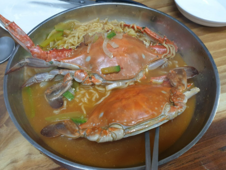특산품인 꽃게가 통째로 한 마리가 들어가 있고 라면뿐만 아니라 꽃게탕, 꽃게강정, 꽃게찜 등 다양한 꽃게요리가 준비되어 있습니다.