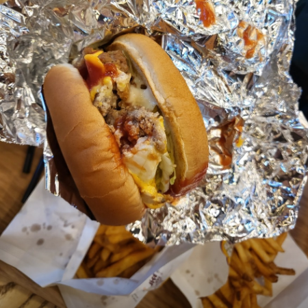 세트를 시키면 옛날느낌으로 포일에 싸서 나오는 버거와 엄청난 양의 감자튀김이 나오고 버거는 푸짐한 소스와 고기 패티에 계란까지 들어가 소스와 조화롭게 어우러집니다.