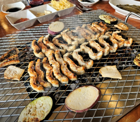 불판 크기부터 압도적이고 밑반찬도 벌써 화려하고 푸짐하게 세팅되고 장어와 구워먹을 야채와 삼을 한 뿌리씩 주시고 야채가 푸짐하게 들어간 폭탄계란찜까지 나옵니다.
