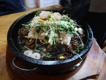 지글지글 소리를 내며 끓고 있는 돌짜장과 누룽지로 짜장에 누룽지를 섞어 먹으니 은근 잘 어울리고 오래 따뜻하게 먹을 수 있고 너무 맛있습니다.