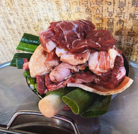 연탄불이다 보니 굽기가 쉽지는 않지만 연탄불에 굽는 고기맛은 정말 맛있고 가장 특별양념으로 묽은 고추장 느낌의 소스를 묵은지와 대파가 듬뿍 들어간 은박 접시에 올리고 불 위에 끓여 먹습니다.