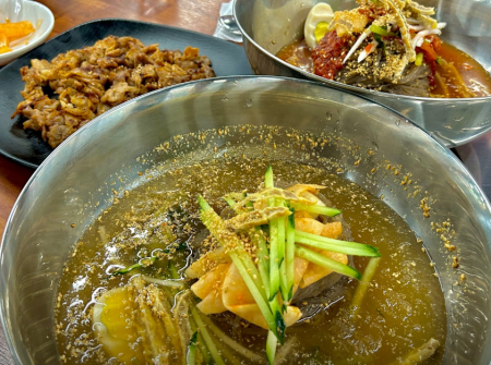물냉면은 육전이 고명으로 올라가 있고 해산물을 우려낸 육수를 사용하여 감칠맛이 매우 뛰어나고 간이 좀 세게 느껴질 수 있지만 매력이 있습니다.