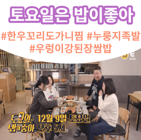 12월 9일 101회 토요일은밥이좋아에서는 경주 6 미 한우꼬리도가니찜 한우꼬리곰탕 우렁이강된장쌈밥 서울의 누룽지족발을 소개하고 있습니다.