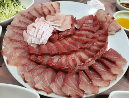 횟집에서 유통되는 방어는 대부분 양식으로 2kg 내외가 많고 대방어는 기름지고 고소한 참맛이 더 느껴져 소방어보다 고소함과 감칠맛을 느낄 수 있습니다.