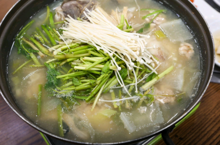 물곰 탕에 사용되는 생선은 물곰치이고 시원한 맛을 내는 무와 향긋한 미나리를 넣어서 지리탕으로 끓입니다.