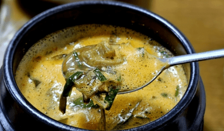 연한 보리잎과 끓여서 먹는 것을 홍어애국, 보리애국이라고 하고 호불호가 있는 메뉴입니다. 홍어애가 들어 있고 약간 물컹하니 부드럽습니다.