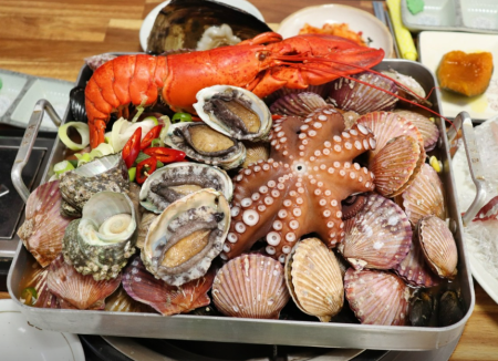 기본 해물찜에 추가로 주문한 랍스터는 비린내가 전혀 느껴지지 않고 전복, 꽃게, 가리비와 소라도 자극적이지 않고 담백한 맛이 느껴집니다.